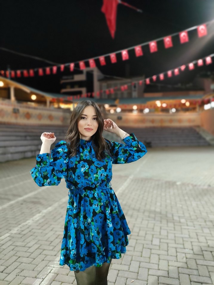 Mavi renkli, uzun kollu ve yüksek yakalı, bol kesim mini elbise. Tie-dye desenli ve şeffaf detaylı, romantik akşamlar için uygun.
