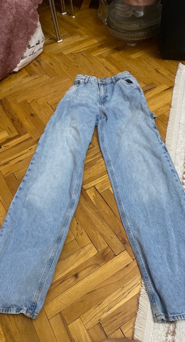 Yumuşak denim kumaştan, pastel mavi tie-dye desenli, salaş kesim midi boy kot pantolon, günlük rahat ve trend sokak stili için uygun.