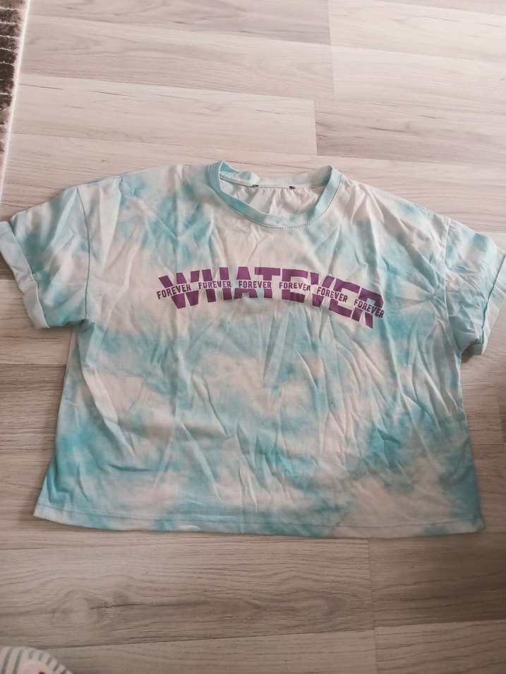 Pamuklu, kısa kollu ve yuvarlak yakalı, bol kesim Pastel mavi tie-dye deseni ve 'FOREVER' yazısı ile rahat ve şık görünüyor. s..m uyumlu