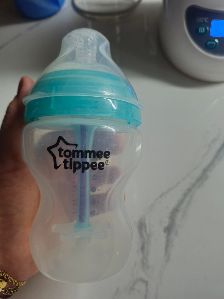 Pastel mavi renkte Tommee Tippee marka bebek biberonu, yumuşak emzikli ve kolay kullanımlı.