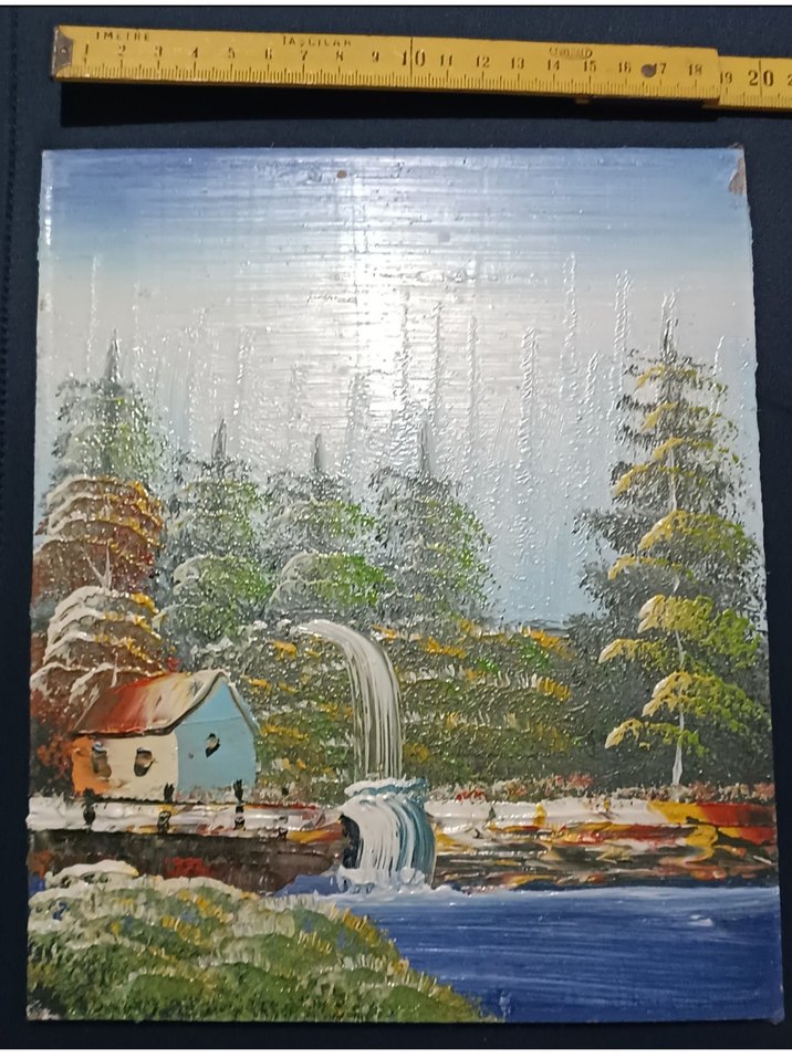 Mavi tonlarda küçük ev, şelale ve ağaçların olduğu doğa manzarası yağlı boya tablo. Dokulu yüzeyi tabloya derinlik katıyor.