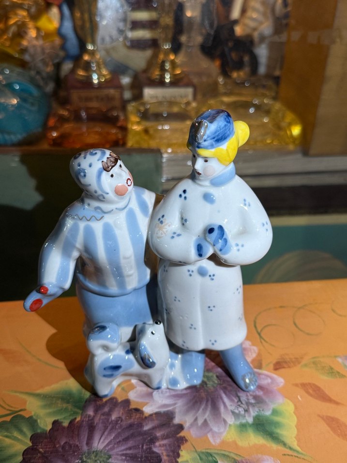 Açık mavi tonlarda giysiler giymiş iki karakterin ve küçük bir köpeğin yer aldığı figürin. Figürlerde detaylı yüz ifadeleri ve kıyafetler bulunur.