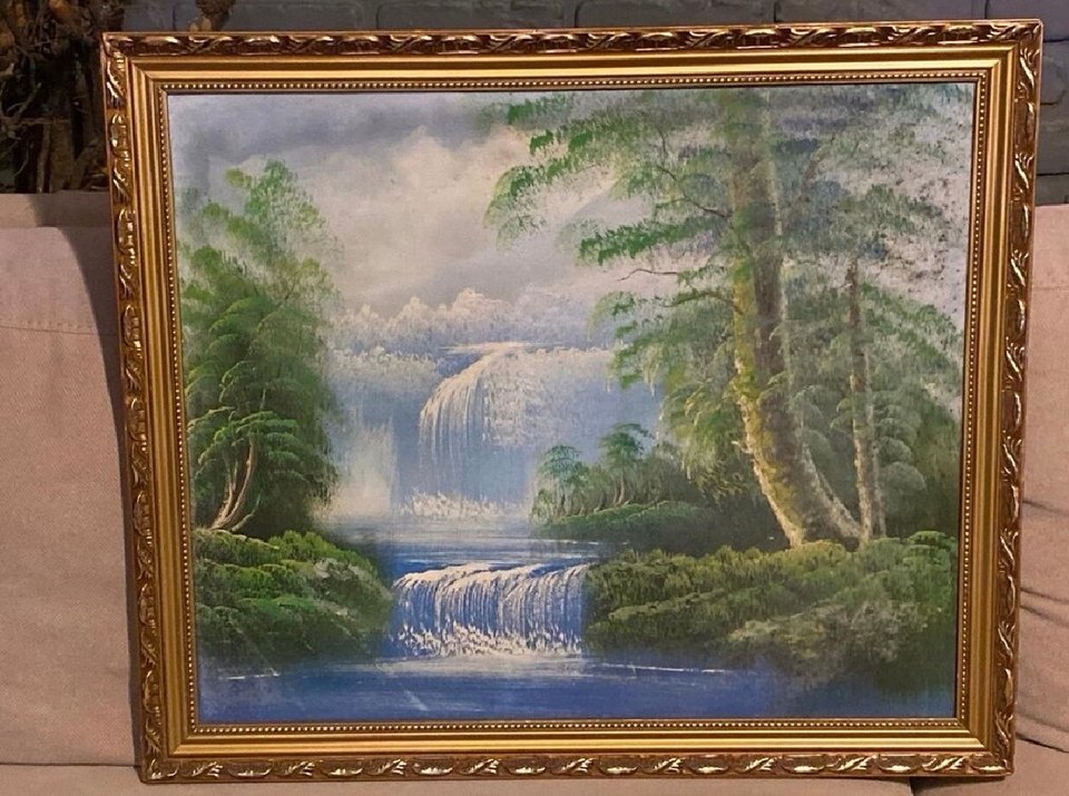 Mavi tonlarda şelale manzarası, çevresinde yeşil ağaçlar ve koyu bulutlar, süslü altın çerçevede yer alıyor. Çok çok eskilerden En boy 56 ,67 cm