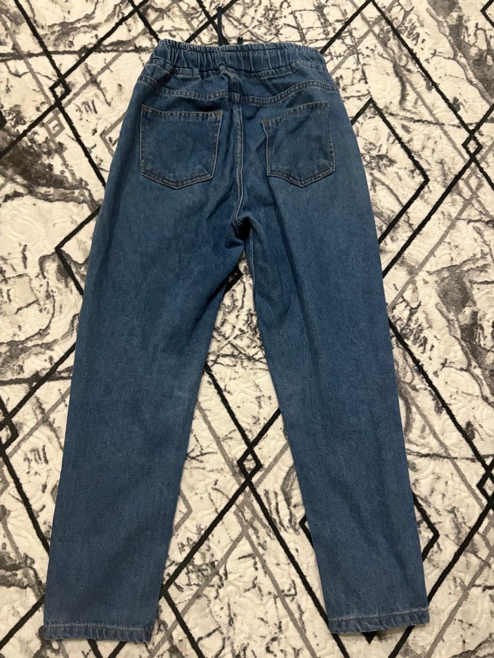 Mavi tonlu, bel detaylı, bol kesim kadın denim pantolon. Normal boyda, günlük sokak stili için uygun.