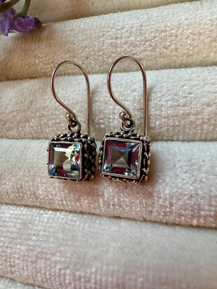 Doğal mavi topaz taşlı ve nakış detaylarıyla vintage bohem tarzında, romantik akşamlar için midi uzunlukta kare tasarımlı gümüş küpe.