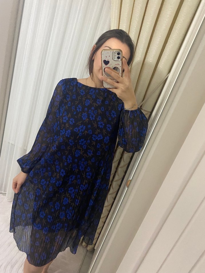 Mavi renkli, uzun kollu, transparan sentetik kumaştan yapılmış, bol kesim midi elbise. Bağlama desenli, günlük kullanıma uygun bohem gotik tarzda.