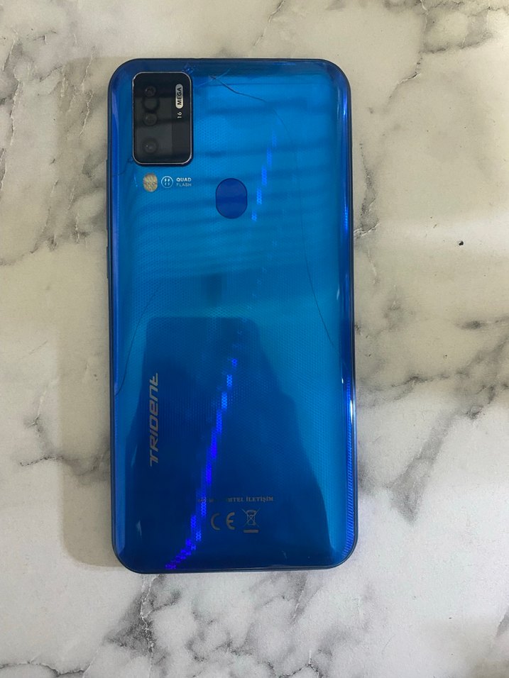 Koyu mavi Trident Android telefon, arka parmak izi okuyucu ve çoklu lens kamera sistemi içerir. Arka panelde çatlaklar görülmektedir. Ekran kırık arka kapak çatlak haricinde sorun yoktur