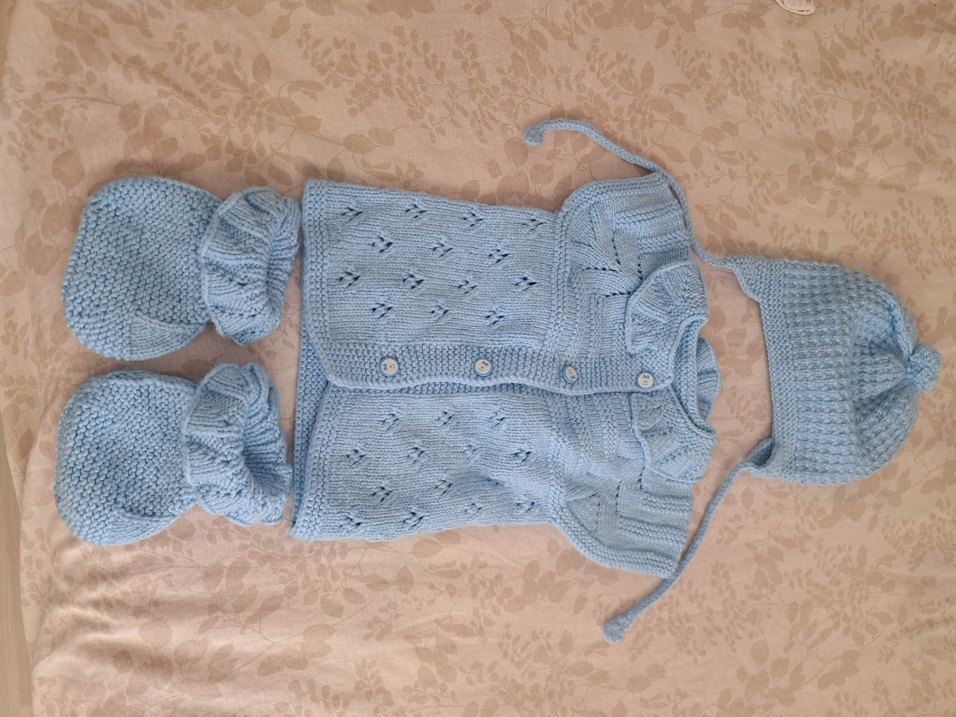 Pastel mavi renkte, uzun kollu ve boğazlı yaka triko bebek erkek takımı. Düğmeli kazak ve uyumlu patik içerir.