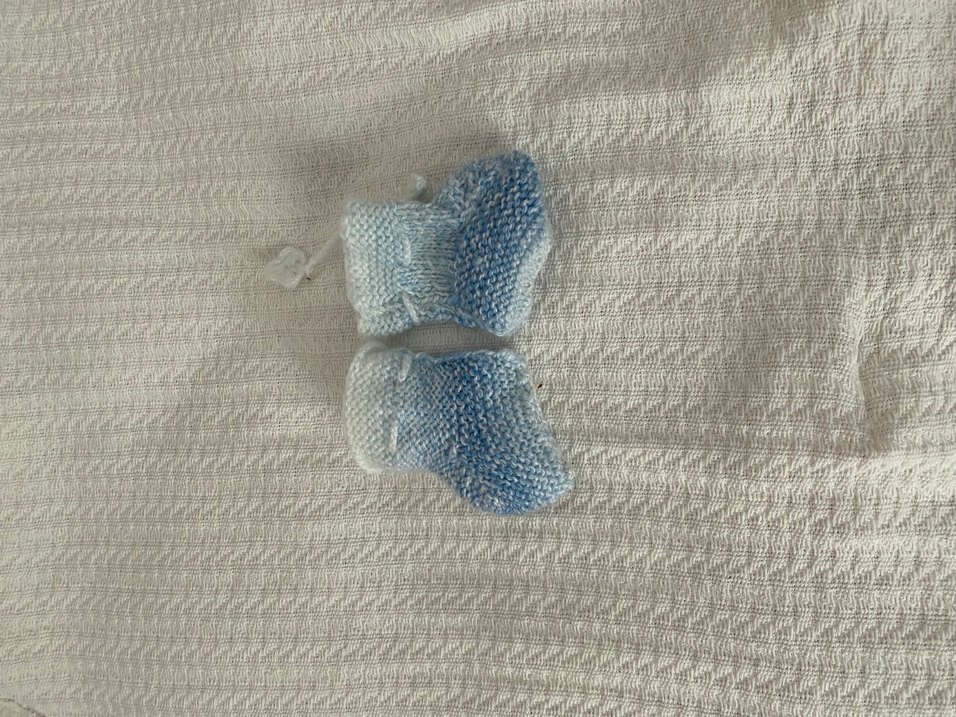 Mavi tonlarda örülmüş, bohem tarzda bebek patikleri, ayakları sıcak tutar.