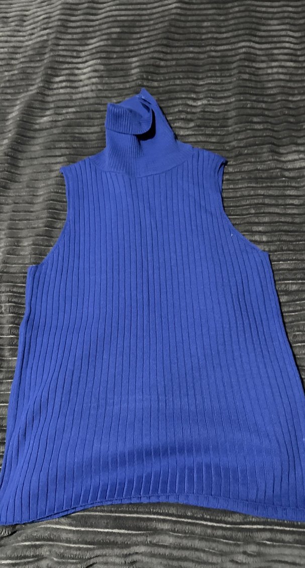 Parlak mavi renkte, boğazlı ve kolsuz, fit kesim kadın kazak. Yumuşak triko kumaştan, normal midi boyunda ve fitilli dokuda, günlük rahat stil için uygun.