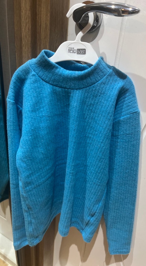 Mavi renkli, triko örme, yuvarlak yakalı ve uzun kol, bol kesim ve normal boyda, yumuşak ve sıcak kumaştan üretilmiştir.
