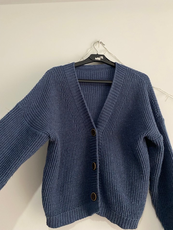 Mavi renkte, triko kumaştan örülmüş, bol kesim, uzun kollu ve notlu yakalı kadın hırka. Orta uzunlukta ve desen içermeyen, günlük kullanıma uygun rahat bir modeldir.