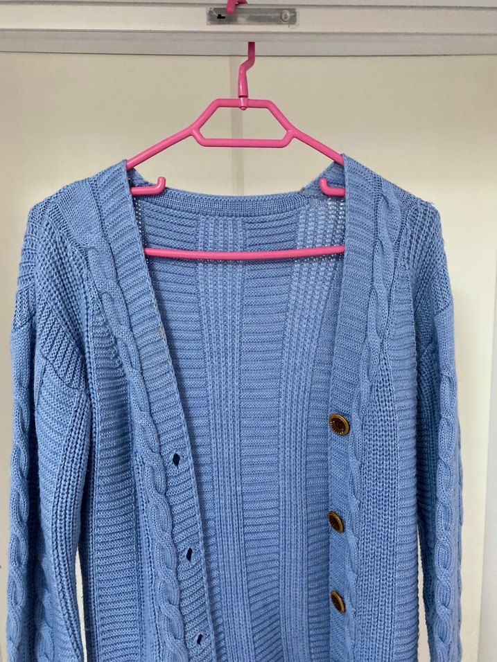 Pastel mavi renkte, çıtçıtlı yakalı ve uzun kollu, rahat kesimli midi uzunlukta triko kadın hırka, günlük kullanıma uygundur.