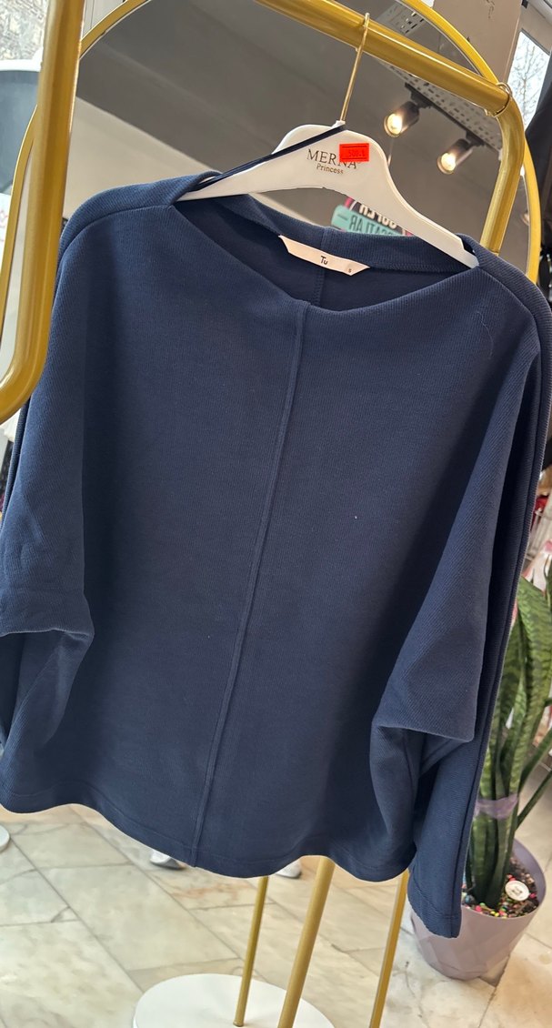 Bu koyu mavi kadın kazak, yuvarlak yakalı ve uzun kolludur. Rahat kesimi ve yumuşak, sıcak kumaşıyla günlük sokak tarzına uygundur. Desensiz ve konforludur.