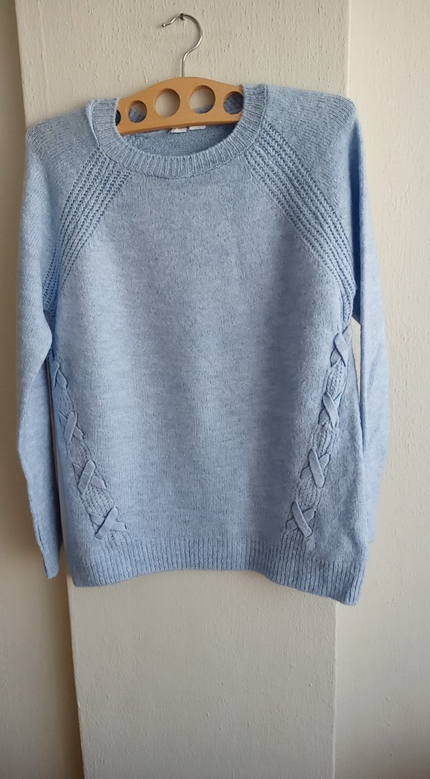 Pastel mavi renkli, yuvarlak yaka ve uzun kollu kadın kazak. Yumuşak triko kumaştan, normal boyda ve bol kesim. Yanlarda ince örgü detayları bulunur. boy 68cm iki koltuk arası 52cm
