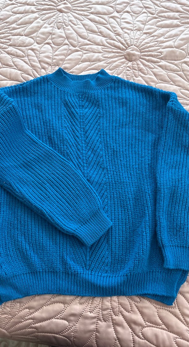 Mavi renkli, triko örme, yuvarlak yakalı ve uzun kollu, bol kesim kadın kazak. Rahat ve sade tasarımıyla günlük kullanım için uygundur.