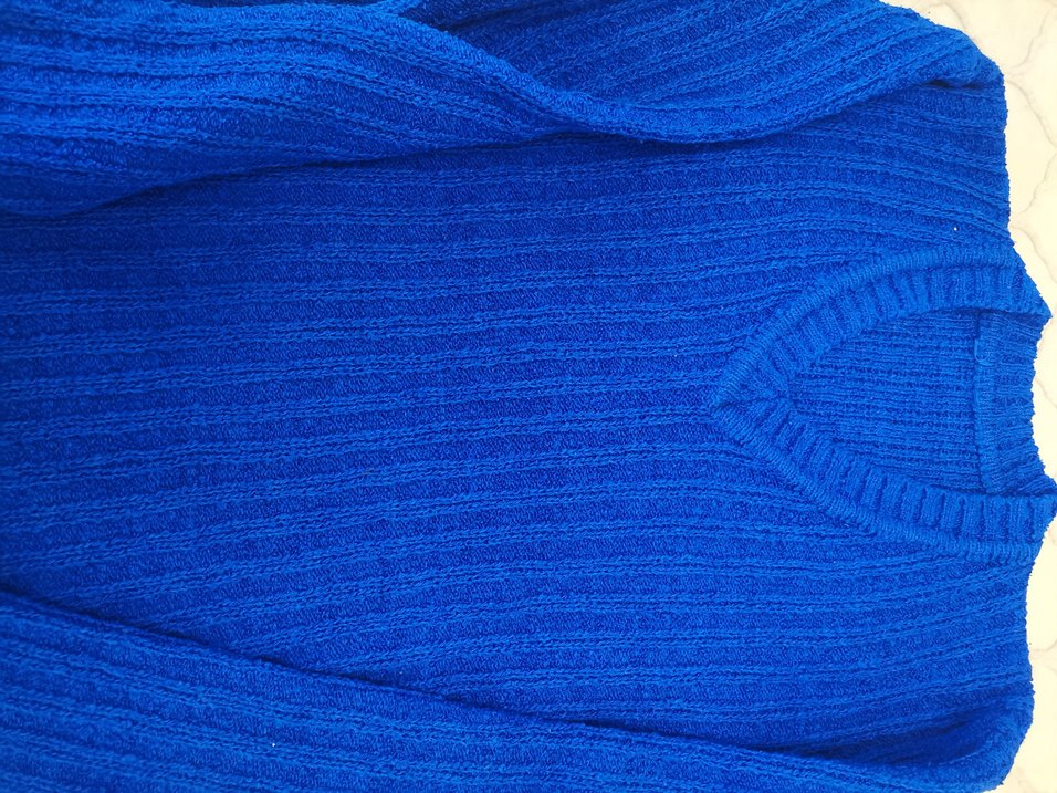 Mavi renkli, triko kadın kazak. Dar kesim, uzun kollu ve desensiz yapısıyla rahat ve çağdaş bir görünüme sahiptir.