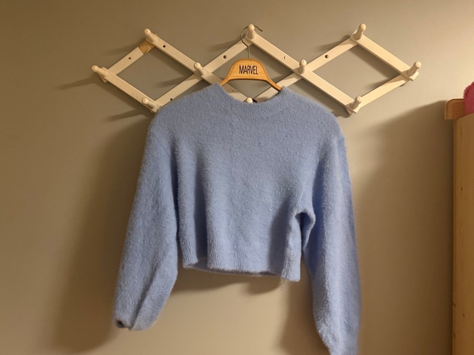 Mavi renkli, yün triko kumaştan, uzun kollu ve yuvarlak yakalı rahat kesim kazak. Günlük kullanım için uygundur. Yumuşak ve tüylü kumaştır. Çok az giyildi. Flaşlı ve normal ışıkla fotoğraflarını ekledim.