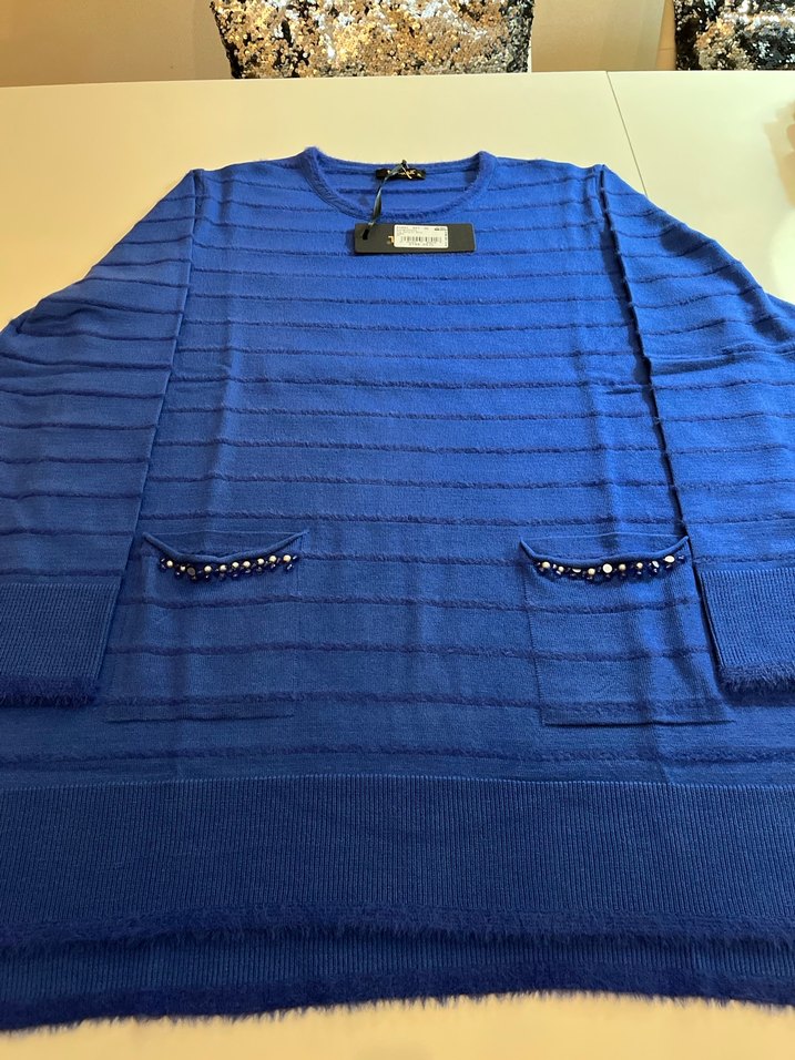 Mavi triko kazak, yuvarlak yaka ve uzun kollu. Rahat bol kesim, normal uzunluk ve boncuk detaylı iki küçük cep içerir. ✨