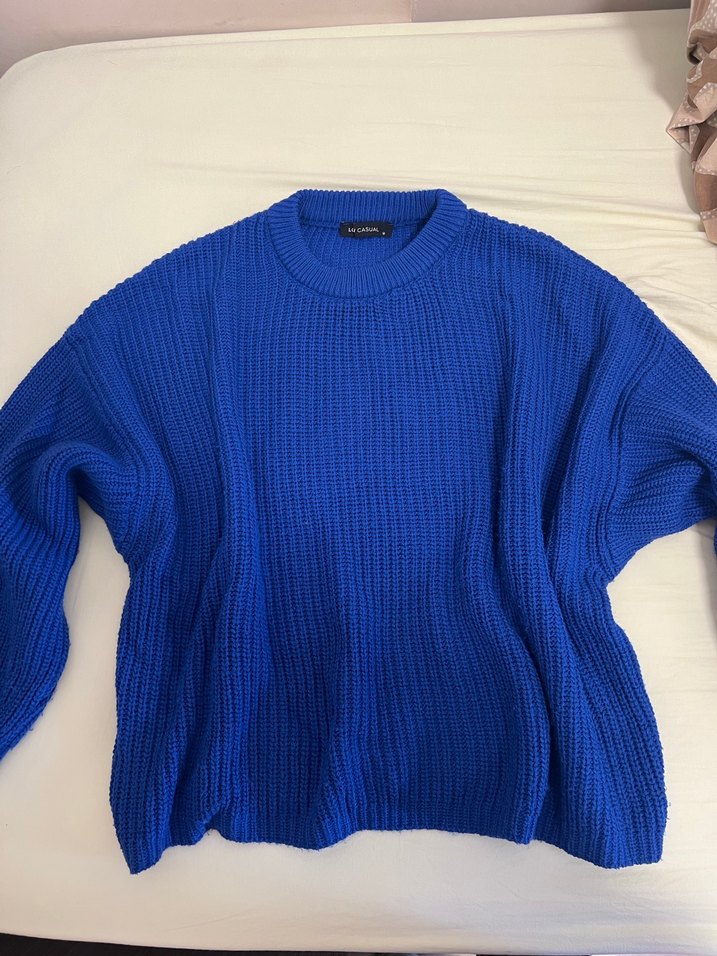 Mavi triko kumaştan üretilmiş, yuvarlak yakalı ve uzun kollu kadın sweatshirt. Rahat kesimi ve normal boyu ile günlük sokak stiline uygundur. Parlak mavi rengi dikkat çeker.