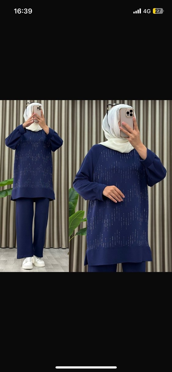 Salaş kesim, uzun boy mavi triko kadın takımı. Bağlama desenli, yuvarlak yaka ve uzun kolludur. Günlük ve modest spor tarzına uygundur. tüm bedenler mevcuttur