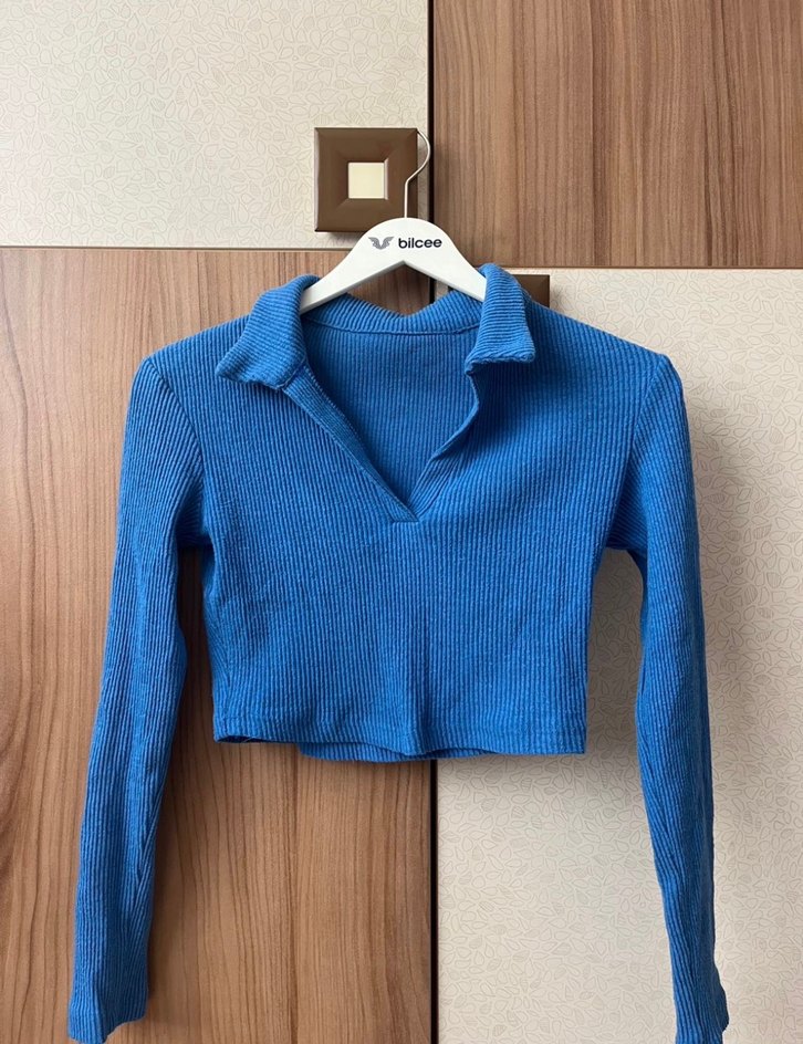 Mavi renkli, triko dokuma, uzun kollu ve yakalı, vücuda oturan kadın kazak. Normal midi boyda, desensiz tasarımıyla günlük kullanıma uygundur.