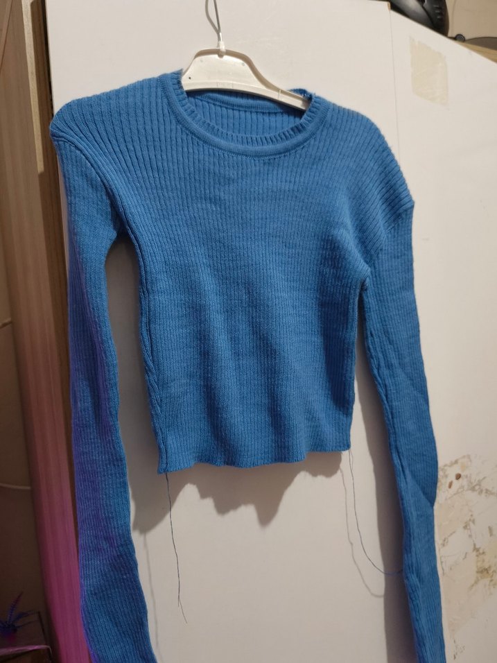 Mavi renkli, uzun kollu ve yuvarlak yakalı, vücuda oturan triko kadın kazak. Günlük kullanıma uygun, rahat ve normal midi boydadır.