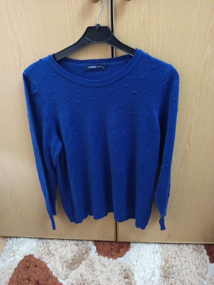 Mavi renkli, uzun kollu ve yuvarlak yakalı triko kazak. Rahat kesimi ve normal boyu ile günlük sokak stiline uygundur.