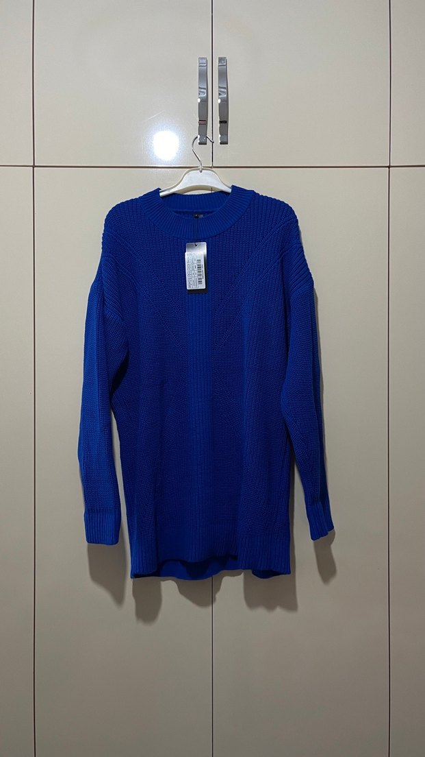 Mavi renkli, triko dokulu, yuvarlak yaka ve uzun kollu, bol kesim kadın kazak, rahat sokak stili için uygundur.