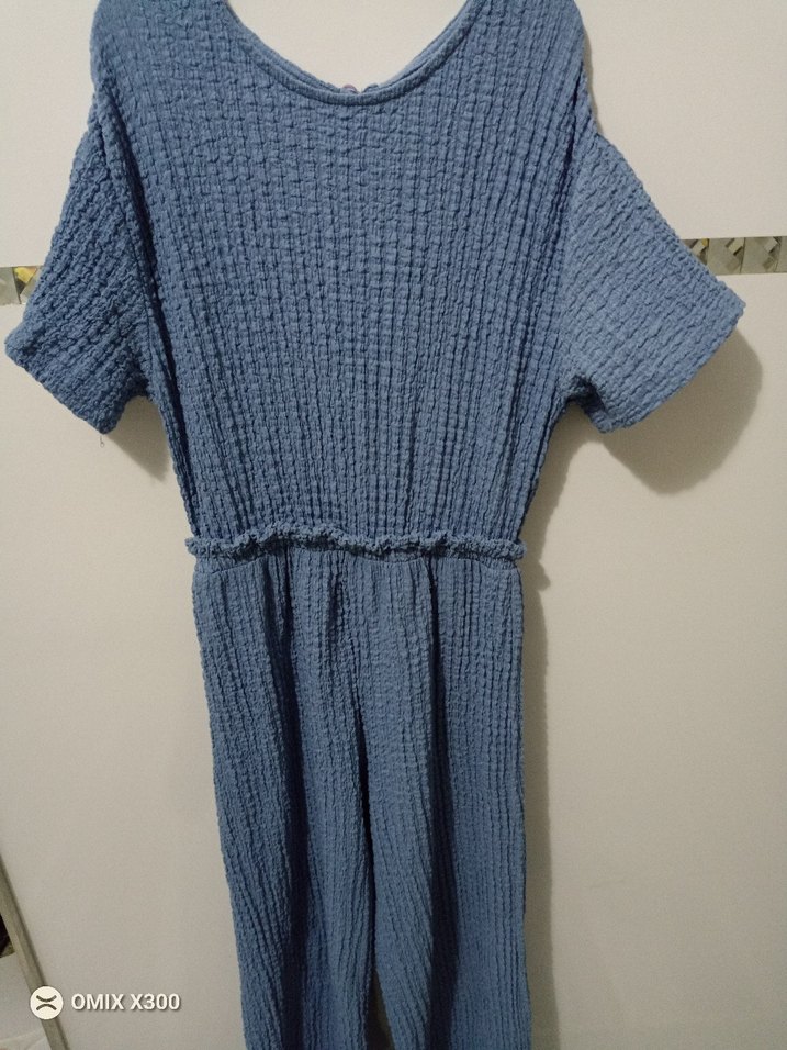 için mavi renkli, triko örme keten kumaştan yapılmış, kısa kollu ve yuvarlak yakalı, bol kesim uzun tulum. Rahat ve deseniz, günlük kullanıma uygun.