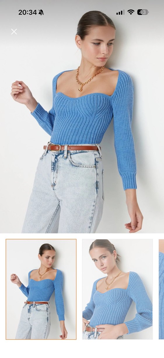 Mavi renkte, triko denim kumaştan, uzun kollu ve tek renk mini kadın kazak. Vücuda oturan kesimi ve kayık yaka detayıyla günlük sokak stiline uygun.