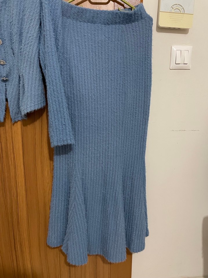 Mavi triko etekli takım , uzun kollu ve kayık yaka detaylıdır. Salaş kesimi ve desensiz yapısıyla günlük kullanıma uygundur.