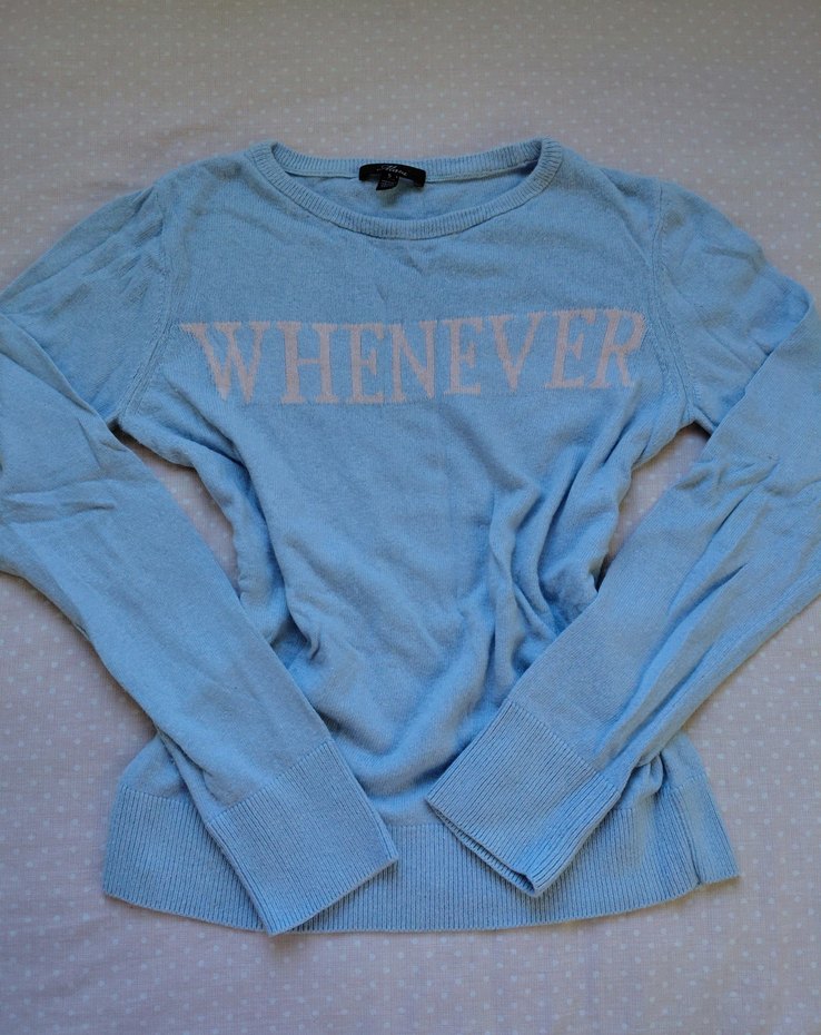 Mavi renkli, uzun kollu ve yuvarlak yakalı triko kazak. "WHENEVER" yazısı ön kısmında örülüdür. Rahat kesimli ve yumuşak keten kumaştan üretilmiştir.