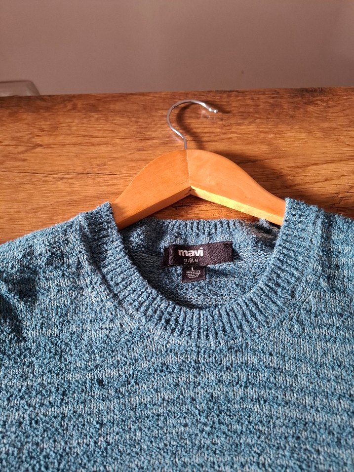 Gri-mavi renk, yuvarlak yaka, uzun kollu, bol kesim yün triko kadın kazak. Günlük rahat kullanıma uygundur.