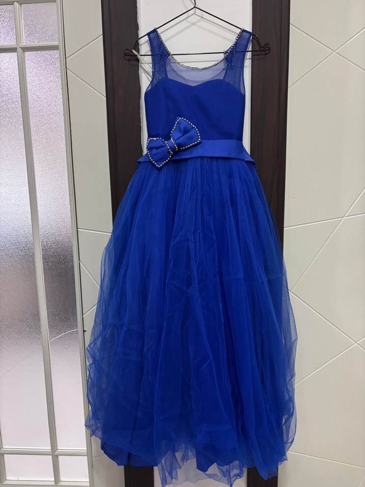Mavi renkli, straplez yaka ve kolsuz kız çocuk elbisesi. Fitted kesim, tül etek ve belde fiyonk detayına sahip. Yumuşak sentetik kumaştan yapılmıştır.