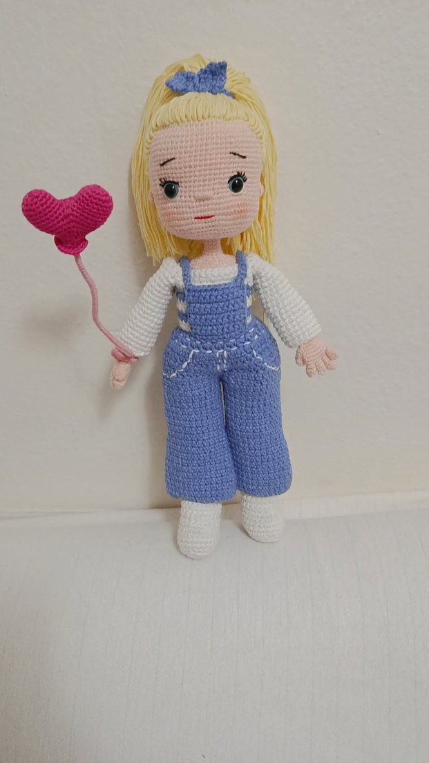 Mavi tulum giymiş, pembe kalp balon tutan, sarı saçlı el yapımı örgü bebek. 40 cm boyutu saçlar taranır elleribacaklari hareketli