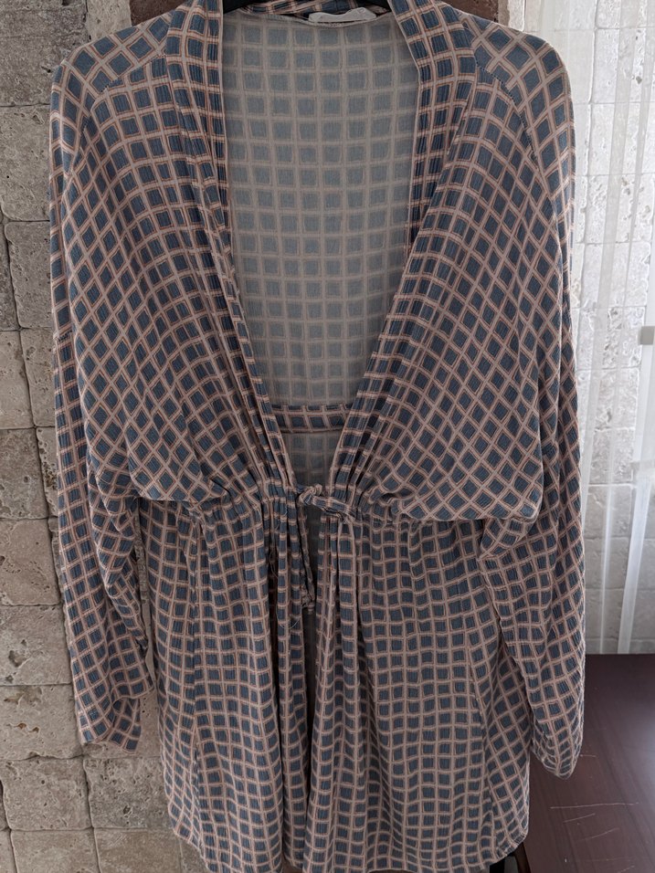 Uzun, salaş kesim mavi-turuncu ekose desenli kimono. V yaka ve uzun kollu, yumuşak,bohem Paris tarzında.