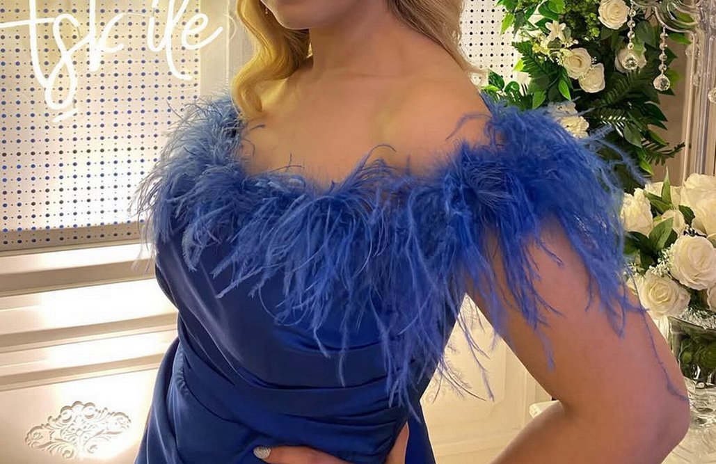 uzun abiye elbise; tüy detaylı omuzları açık. Parlak mavi saten sadece bir defa nişanımda giydim kumaşı aşırı kaliteli yumuşacık bir saten 40-42 bedene rahatlıkla uygun hiçbir sıkıntısı yoktur