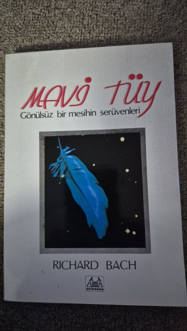 Richard Bach'in "Mavi Tüy" adlı romanı, gönülsüz bir mesihin serüvenlerini anlatıyor. Kapakta mavi tüy simgesi var.