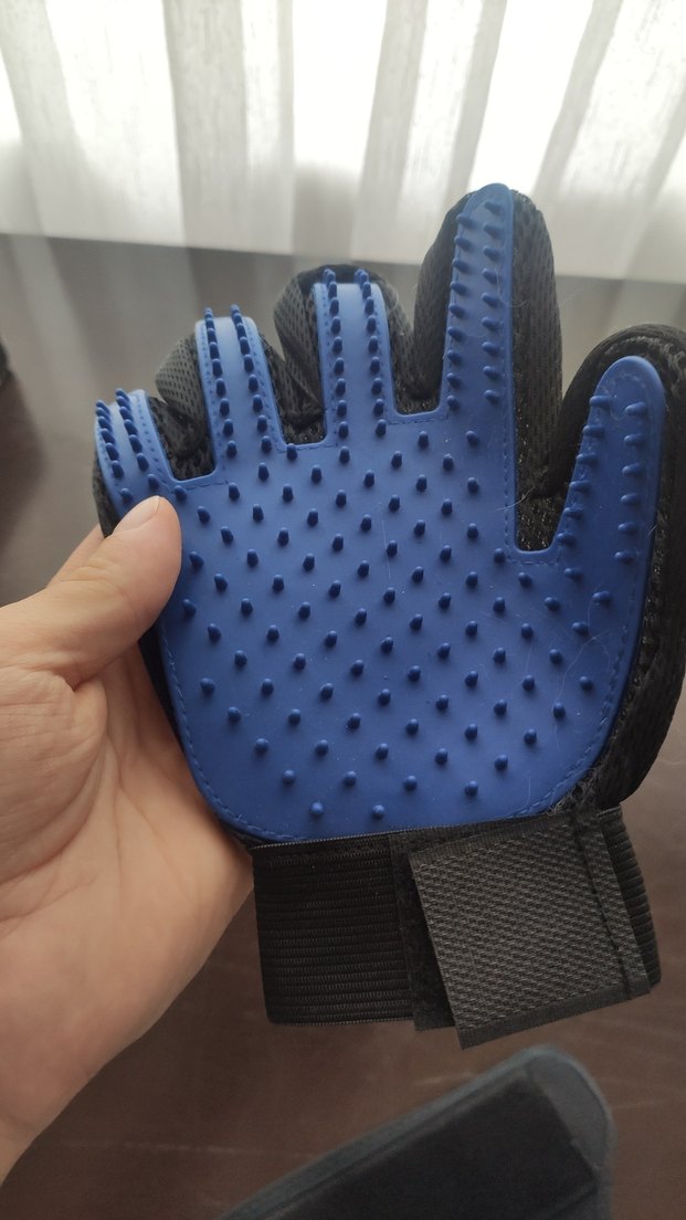 Mavi tüy temizleme eldiveni, etkili tüy toplama için yumuşak kauçuk uçlara ve rahatlık sağlayan nefes alabilen örgü arka kısma sahiptir. Ayarlanabilir bilek kayışı bulunur.