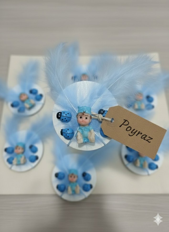 Pastel mavi renkli, yumuşak tüyler ve küçük uğur böceği detaylarıyla süslenmiş bebek biblo magneti kişiye Özel