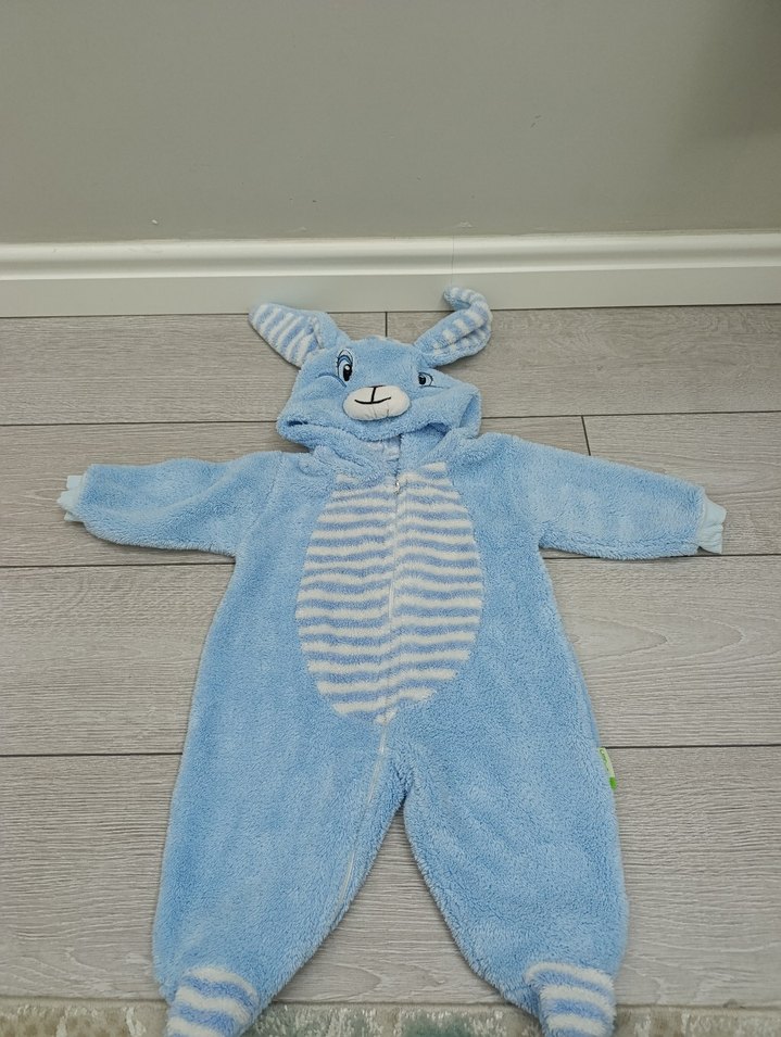 Mavi tüylü, kapüşonlu ve kulak detaylı bebek tulumu. Ön kısmı çizgili gri renkte, yumuşak ve sıcak kumaştan üretilmiştir. ❄️