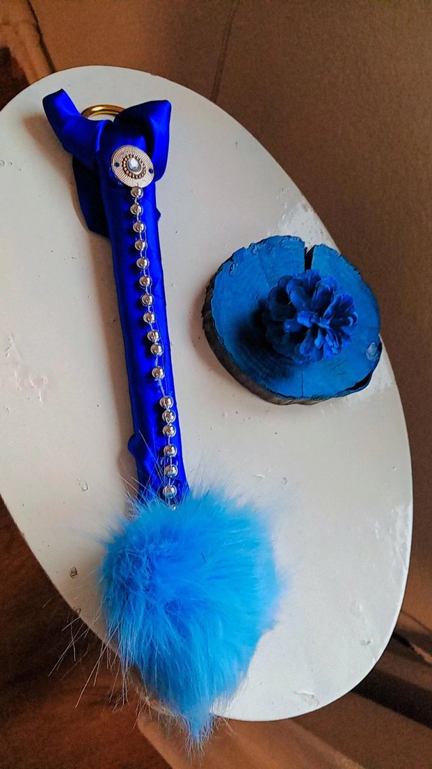 Yumuşak tüylü ponpon ve süslü taşlarla mavi kedi aksesuarı, oyuncu kediler için uygundur.