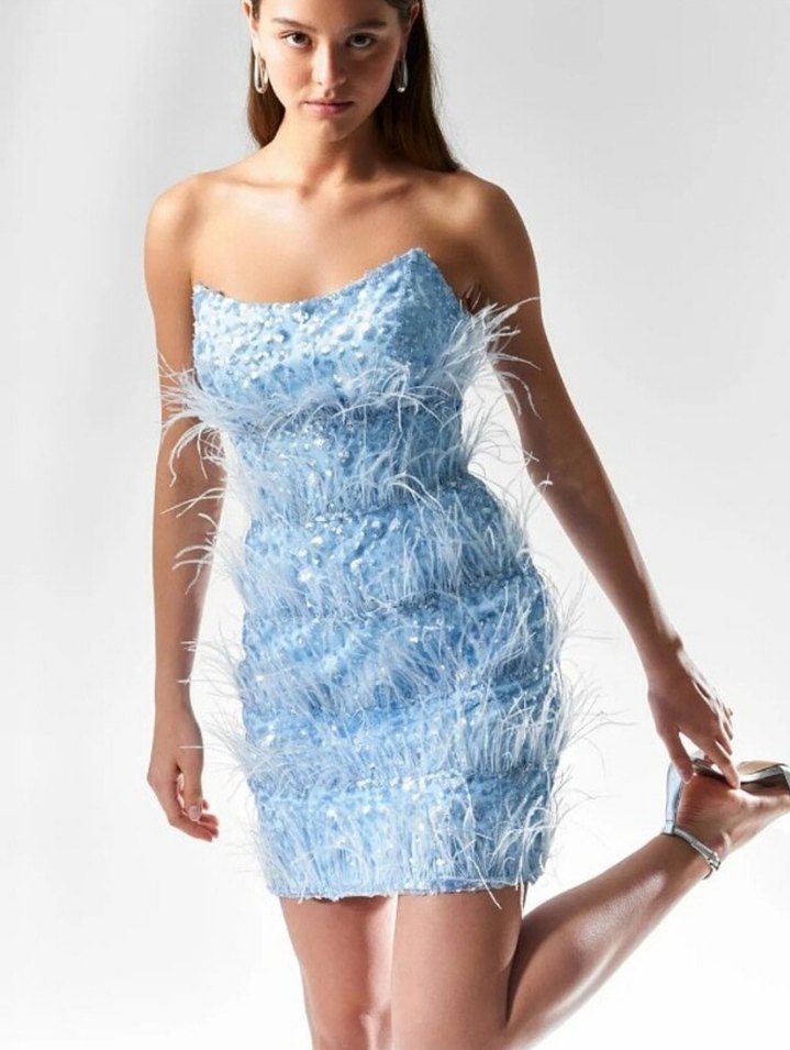 Mavi, tüylü detaylı, straplez ve mini uzunlukta, vücuda oturan bu elbise partiler için modern ve şık bir seçimdir. Tie-dye deseniyle dikkat çeker.