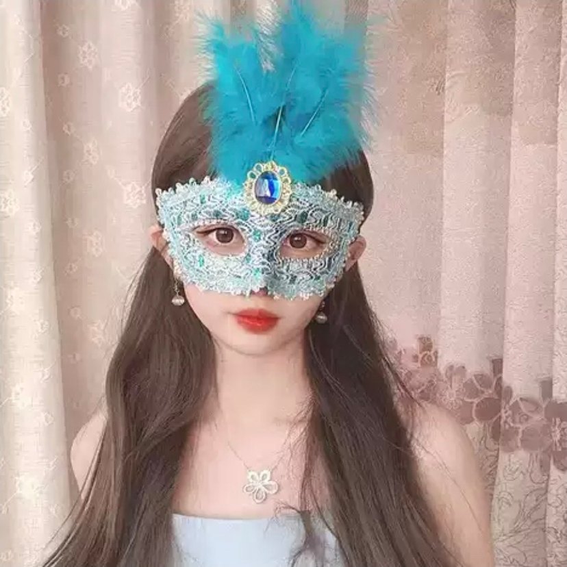 Kadınlar için mavi dantel detaylı, büyük mavi taş ve dekoratif tüylü göz maskesi. Şıklık katan özel tasarım.