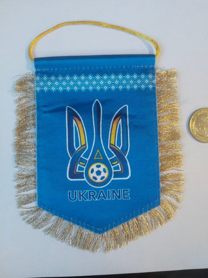 Mavi renkli, Ukrayna amblemi ve 'UKRAINE' yazısı bulunan, altın püsküllü ve asma ipli