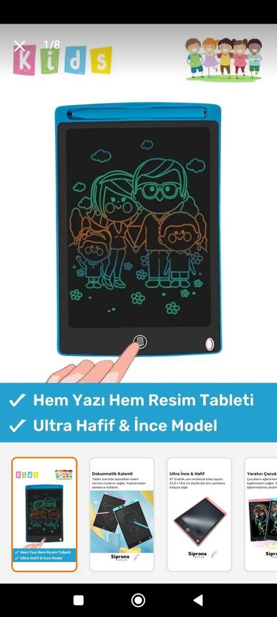 Mavi renkli, ultra hafif ve ince tasarıma sahip tablet hem yazı hem resim için uygundur. Dokunmatik kalemle kullanılır, taşıması kolaydır. ✍️