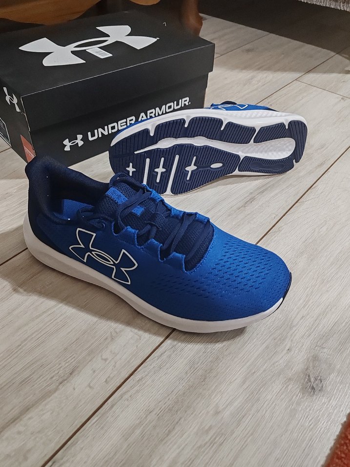 Under Armour erkek koşu ayakkabısı, bağcıklı tasarımı ve renkli mavi üst yüzeyi ile dayanıklı kauçuk tabana sahiptir, spor ve günlük kullanıma uygundur.
