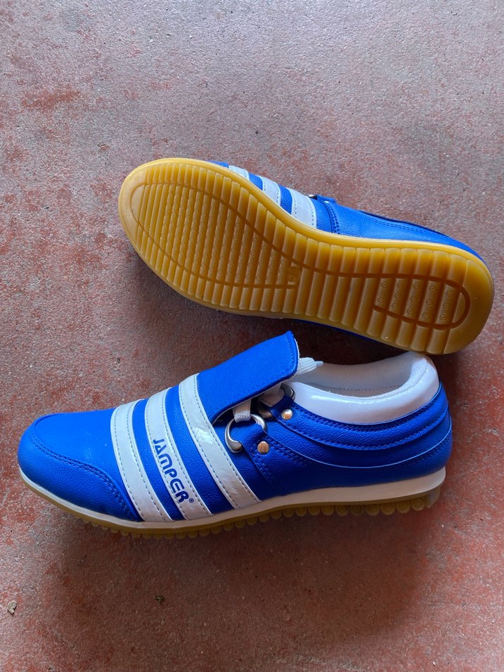 Mavi ve beyaz çizgili, bağcıklı erkek spor ayakkabısı. Kauçuk tabanlı, rahat ve şık bir tasarıma sahiptir.