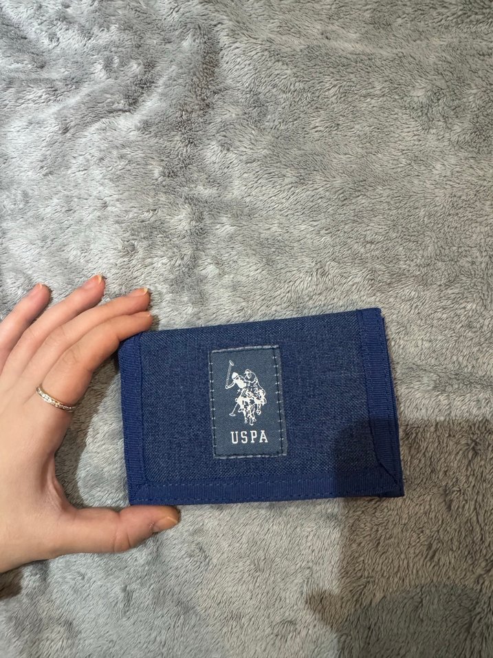 Mavi renkte, yumuşak fleece kumaştan yapılmış, Velcro kapaklı ve baskılı USPA logolu erkek cüzdanı. Günlük rahat kullanıma uygun.